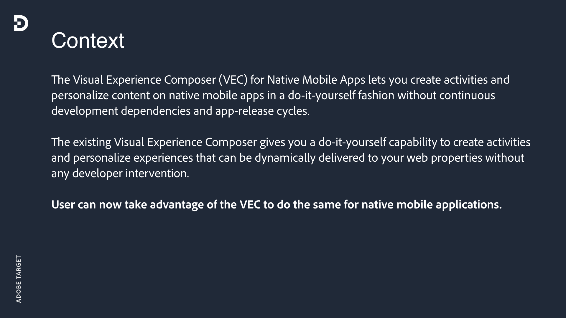 Deploying personalization and A/B testing strategies to Mobile Apps can take several weeks using the conventional approach. Moreover, It requires developer involvement to make changes, thus reducing the opportunity and extent for optimization. To extend Adobe Target's marketer value to mobile apps, we needed to build support for mobile apps in VEC.